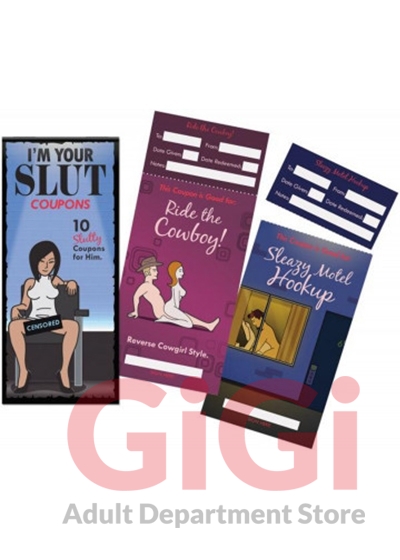 10 Slutty Coupons for him to enjoy. He gets to present coupons to her when he wants to redeem one of the humorous, yet sexually satisfying, coupons. Examples include, "Be My Porn Star!” and "Pull My Parking Break.” Includes: 10 Hilarious and Sexy Coupons