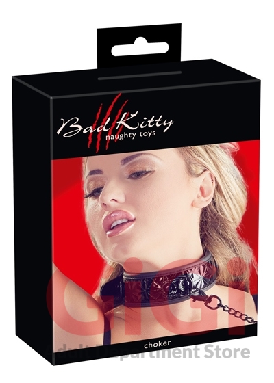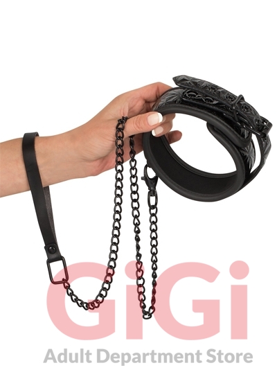 Slightly padded, black collar with an embossed surface in a beautiful diamond cut pattern. With rounded borders. Includes a matte black leash with a snap hook and wrist loop (complete length 88 cm). Collar 5.5 cm wide, the circumference can be adjusted from 40 to 48 cm. Material: polyurethane, metal, split leather, synthetic rubber.