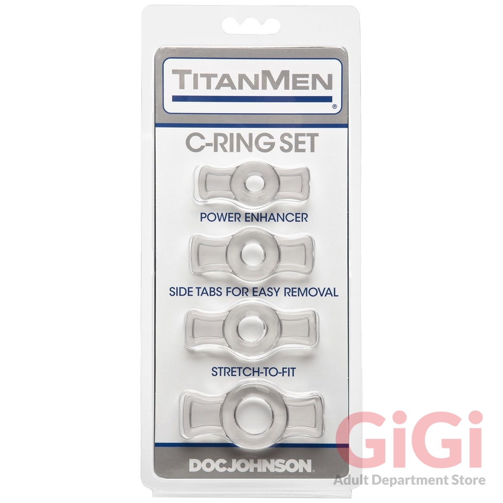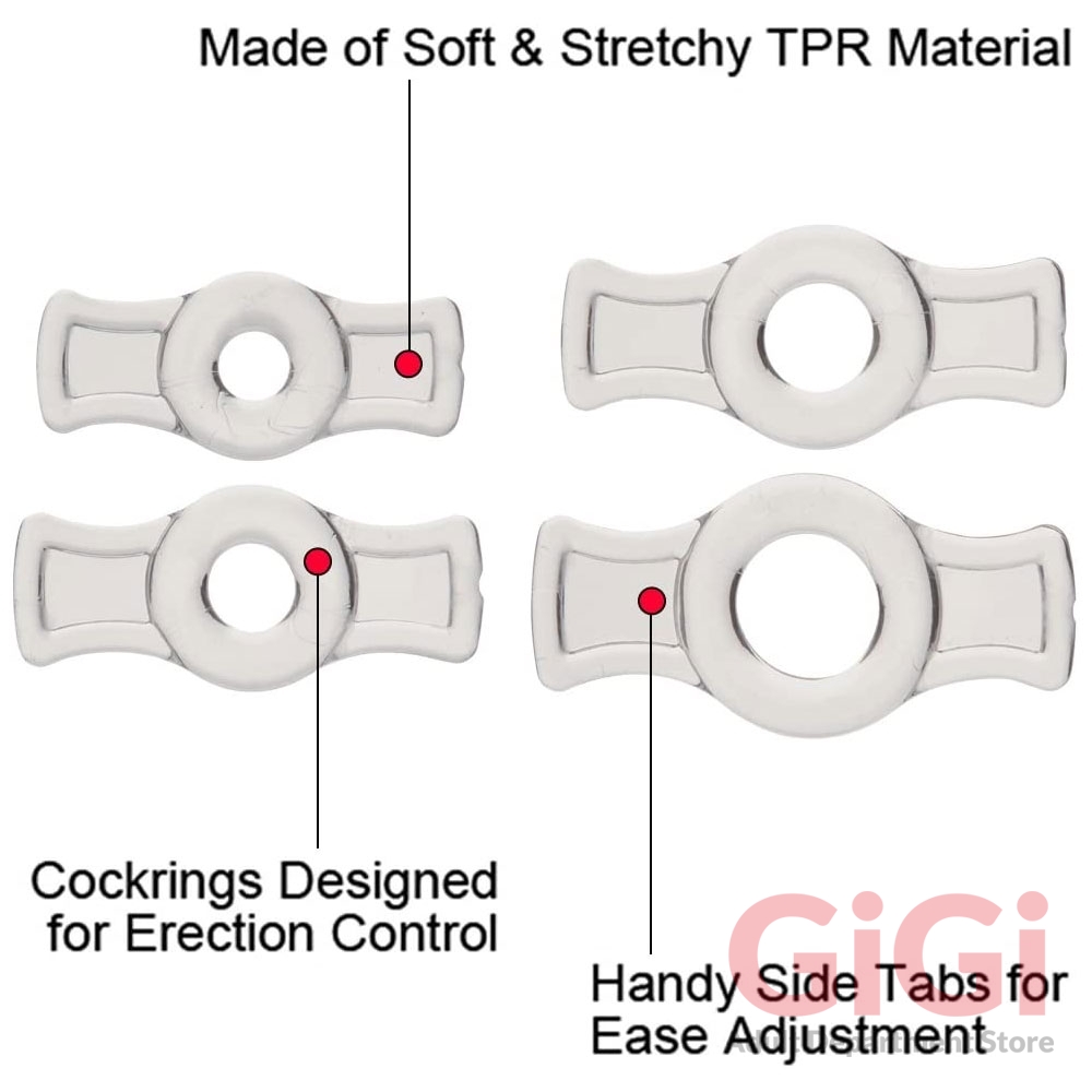 Please your customers with the most convenient and manageable cock rings available. These TitanMen Tools cock rings stretch to fit with the aid of easy grip side tabs. Each set contains 4 rings ranging in size from 0.4" to 0.75" un-stretched. The largest flexible ring can accommodate up to a 3" diameter shaft. The rings are easy to place and remove, even with slippery hands, because each tab features a thick border, allowing the rings to be adjusted with ease. The TitanMen Tools cock ring set is made of phthalate-free TPR and is available in Black, Blue and Clear.