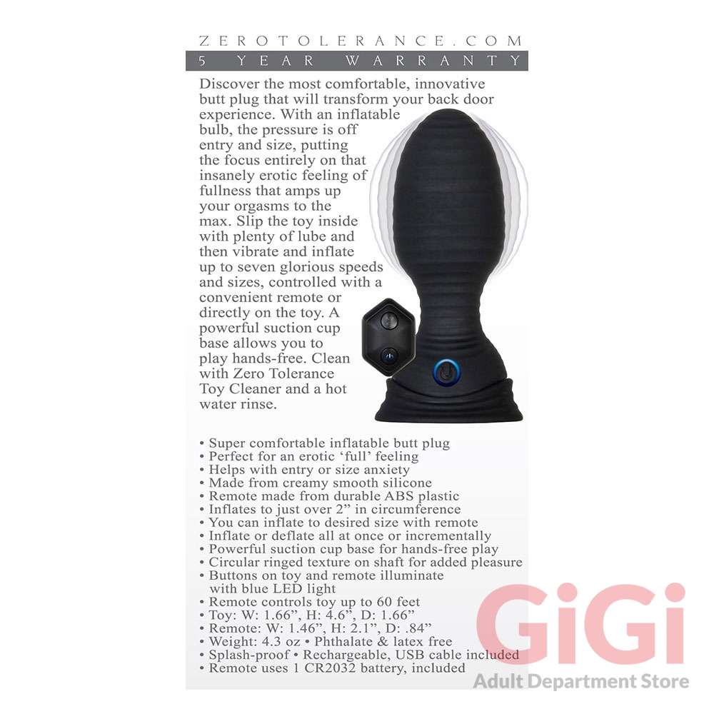 Super comfortable inflatable butt plug Perfect for an erotic full feeling. Helps with entry or size anxiety. 7 inflatable and vibrating functions work together. Inflates to just over 2 inches in circumference. You can inflate to desired size with remote. Inflate or deflate all at once or incrementally. Powerful suction cup base for hands free play. Circular ringed texture on shaft for added pleasure. Buttons on toy and remote illuminate with blue LED light. Remote controls toy up to 60 feet. Splash proof. Rechargeable, USB cable included. Remote control uses 1 CR2032 battery, included. Five years warranty.