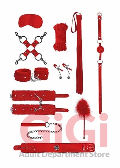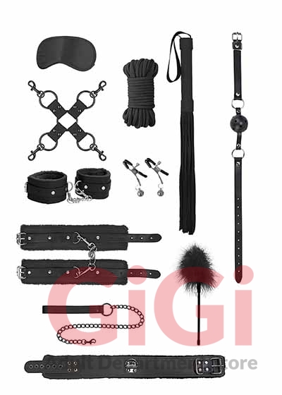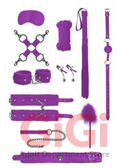 For those couples looking to take their fetish play to the next level, this is the kit. Everything you need to continue exploring your kinkier side. Comes with breathable ball gag, furry bonded leather hand and leg cuffs, satin eye mask, flogger, 11 inch feather tickler, 10 meter japanese silk rope, hogtie connector, nipple clamps, and furry bonded leather collar with metal leash.
