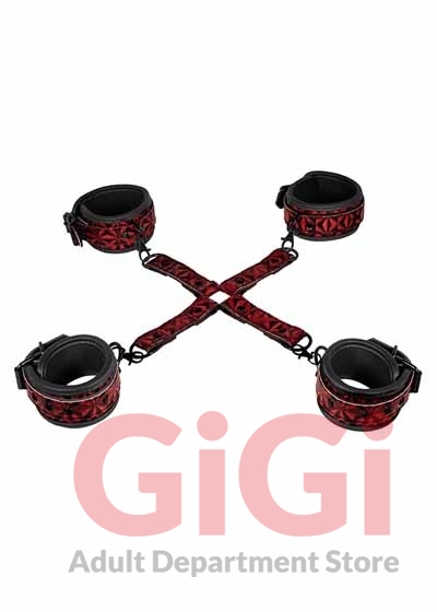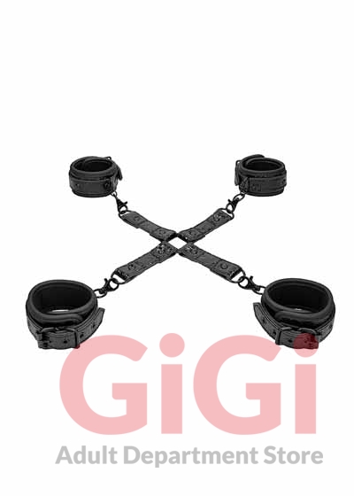 "Getting on all fours” will have an exciting new meaning in your sex life! The OUCH! hogtie fulfills all your kinky dreams, and more! In any BDSM collection, a hogtie plays an important role and with this high-quality equipment you can have a go at it yourself. With their fashionable diamond pattern, these neoprene and faux-leather cuffs and cross really stand out from the crowd! The hogtie consists of 2 ankle cuffs, 2 handcuffs, and a "cross” with four O-rings. The ankle cuffs are 39 cm (15.4”) long and 5.5 cm (2.2”) wide with 7 holes for size adjustment. The handcuffs are 36 cm (14.2”) long and 5 cm (1.97”) with 6 holes for size adjustment. The hogtie "cross” has 4 lengths of 27.2 cm (10.7”) each.