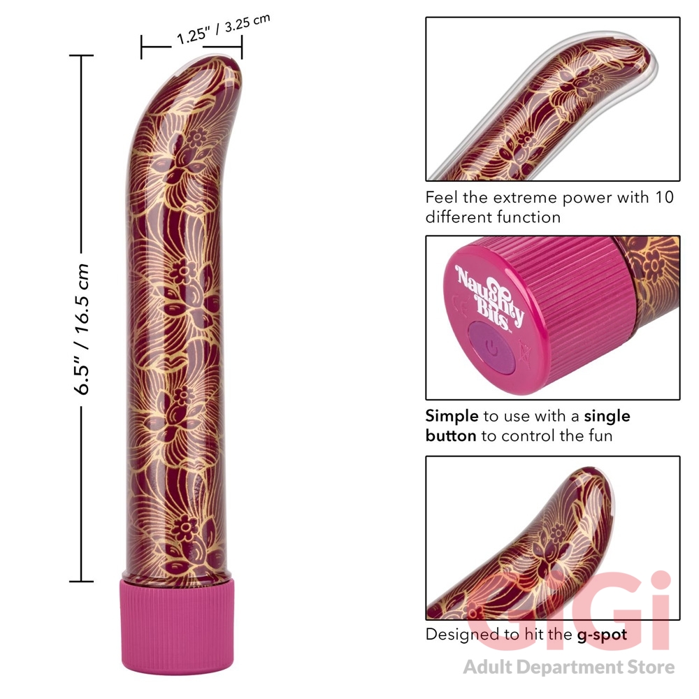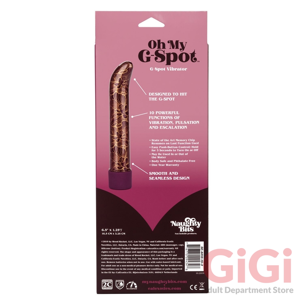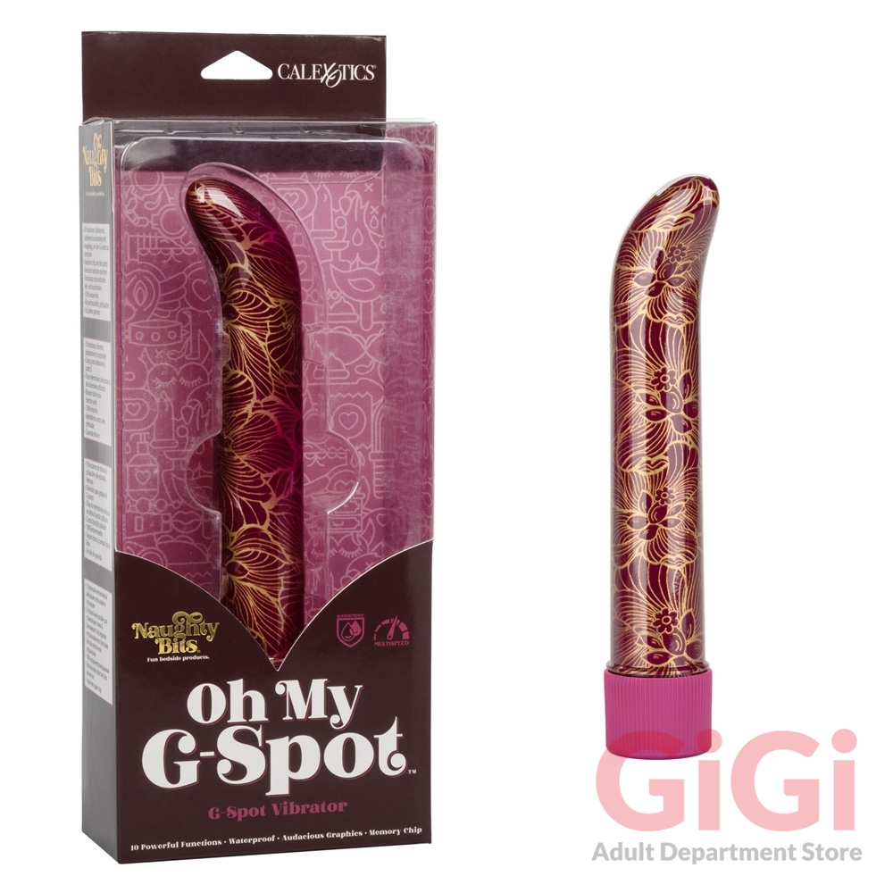 OH MY G! The Naughty Bits™ Naughty Bits™ Oh My G-Spot™ G-Spot Vibrator knows just how to make you say Oh my G! The soft floral pattern vibe has a smooth, seamless body and curved tip packed with 10 functions of shaking vibration.Get playful while you cycle through 10 indulgent vibration, pulsation and escalation functions with the easy-touch control button. With curves in just the right places, the vibe’s sensual curve tip delivers deep, rumbling gyrations directly to your g-spot! The erotically curved design is made to perfectly caress you most intimate curves so you can always hit just the right spot.While the sleek, seamless vibe body inspires dirty fantasies, the bold design and direct message on the shaft make this pleasure toy stand out in any nightstand. Power up your pleasure with 2 C batteries.The Naughty Bits™ collection is made to stand out in any nightstand with eye-catching designs and orgasmic features. The sensually curved tip and soft floral pattern of this gorgeous massager will make even the most stylish lover smiling before and after.