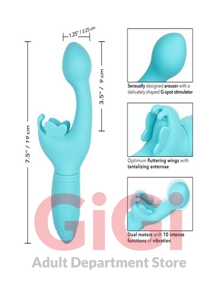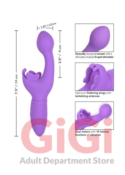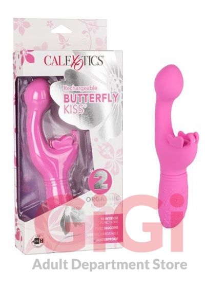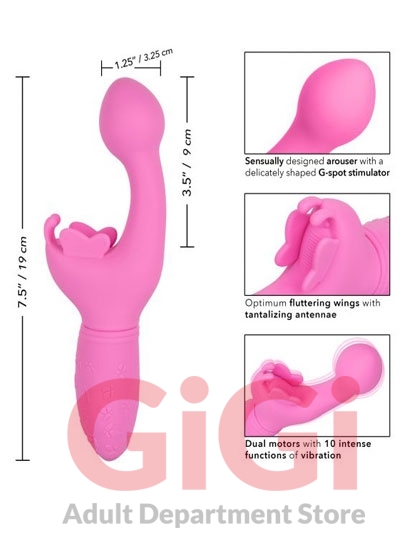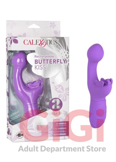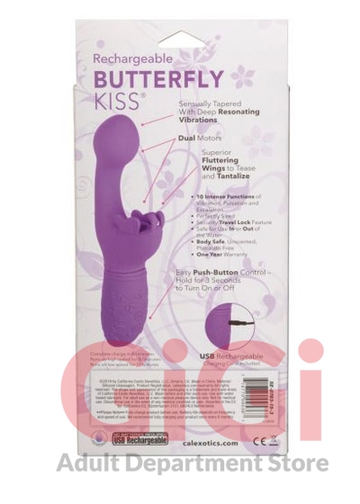 Designed for her intimate pleasure, the Rechargeable Butterfly Kiss® is an erotic toy box must-have for any pleasure loving woman. This sensually contoured massager knows your intimate curves and is here to indulge your fave pleasure point with 10 functions of vibration. The blushing butterfly is a bold option for beginners and a sensual option for the erotically experienced. Indulge in 10 intense functions of vibration, pulsation and escalation with the push-button control. Dual high-intensity motors put out knee-shaking vibration throughout every inch of this passionate vibrator. The fluttering wings and antennae of this flexible butterfly flutter faster with every increase of vibration to tickle external sweet spots. Get playful with up to 75 minutes of low speed or 50 minutes of high speed vibrations with the easy touch button control. Recharge your pleasure in only 1 hour with the provided USB charging cable.