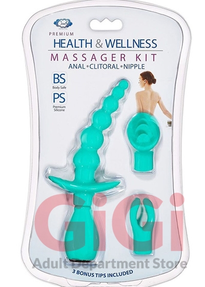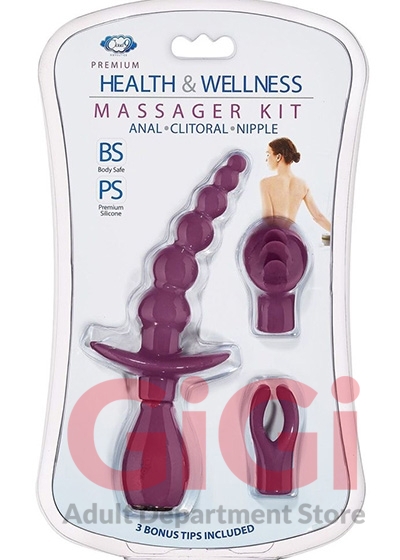 Cloud 9 Health and Wellness Anal, Clitoral and Nipple Massager Kit Plum. The Cloud 9 Premium Health and Wellness Massager Kit comes complete with a fully splashproof for use in the shower only, rechargeable, vibrator with 3 bonus attachment tips. The elegant design and ergonomic shape make it easy to hold with one button control.