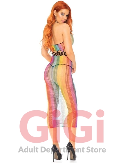 Rainbow net long halter dress with cut out detail.