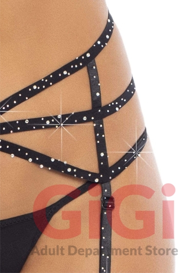 Strappy elastic rhinestone garter belt with O-ring detail.