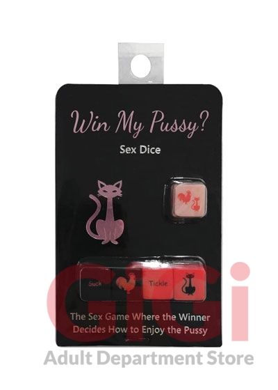 Win My Pussy Dice Game from Kheper Games. The foreplay game that leads to enjoyment of her pussy. Players take turns rolling all five dice. The black dice represent him and the red dice represent her. Each set has an action die and a body part die. The Cock or Pussy graphics on the dice are wild and a player wins by rolling either three cocks or three pussies. The winner gets to decide how the pussy and cock are used for either oral sex or for a sex positions. Includes: 5 Dice.