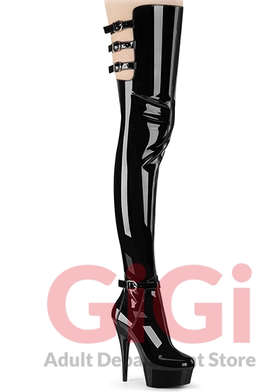 Pleaser. 6 Heel, 1 3/4 PF Multiple Buckle Thigh Boot, Side Zip
