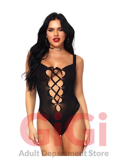 Opaque lace up thong teddy.