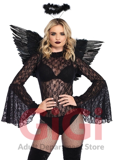 Deluxe black angel kit consisting of lavish black feather angel wings with tie on straps and matching marabou halo attached to an easily adjustable head band. A popular choice for fallen angel characters during the Halloween season.