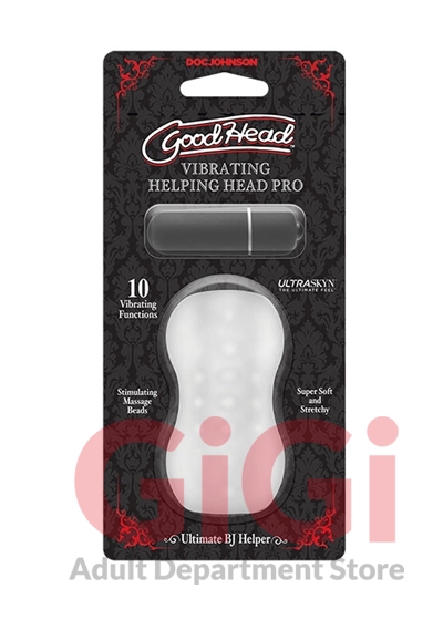 Doc Johnson's new GoodHead Vibrating Helping Head Pro is a 3-inch mini stroker and bullet vibe specifically designed for handheld use to heighten the sensations and pleasure during fellatio. Soft on the outside, and with stimulating massage beads on the inside, this uniquely-shaped stretchy stroker is made from our clear ultra-realistic ULTRASKYN, and the vibrator fits right in to provide a more intense sensation. Turn GoodHead into great head tonight!