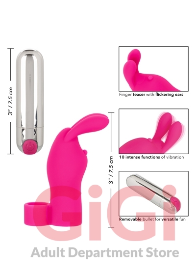 Take pleasure back into your own hands and get playful with pleasure at your fingertips with the Intimate Play™ Rechargeable Finger Bunny. The tiny tickler’s fluttering bunny ears, removable bullet and 10 function of vibration are sure to tease and please your most intimate curves with ease. This high-powered finger teaser is crafted with flickering teasers and a removable bullet for versatile play.