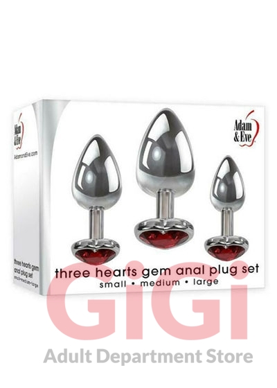 This set of gleaming metal anal plugs with sparkling jeweled red heart bases is sure to make you fall in love with anal fun. Each plug is crafted from smooth, weighty metal for an easy glide in and intense feel. Three unique sizes let you find just what’s right for you. Start small and work your way up to the largest size for the most incredible anal pleasure you’ve ever experienced! The jeweled flared base makes inserting it easy, and keeps the plug in place no matter how wild the action gets. The metal also holds temperature, so experiment with chilling or warming the plugs for even more excitement. Clean with Adam & Eve Toy Cleaner and a warm water rinse.