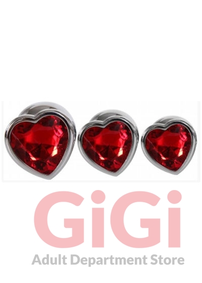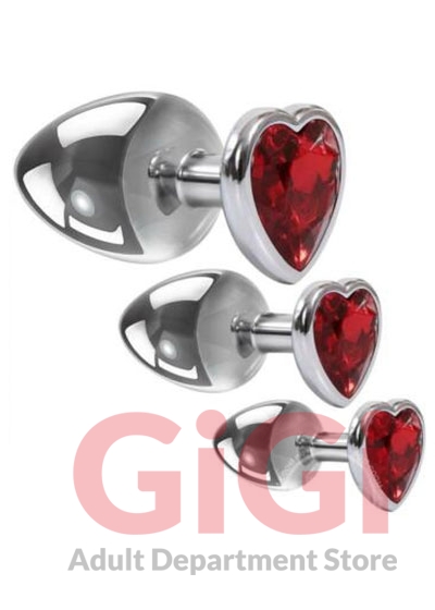 Set of 3 metal anal plugs with red heart jewel bases