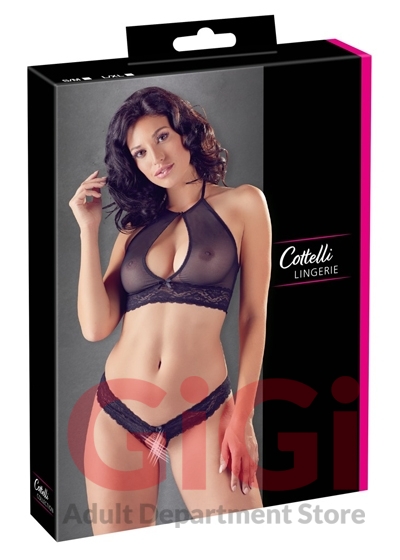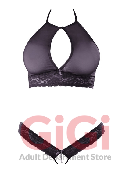 This beautiful set stands out because of its delicate lace and transparent material over the breasts. It is perfect for an exciting night but it can also be worn teasingly underneath a shirt during the day. The string has a strip of lace around the waist and is crotchless. It also has a small chain in the crotch area for additional stimulation.