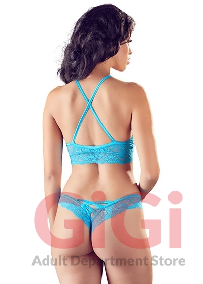 Wireless bra and briefs made out of soft lace. The bra has stretchy straps that criss-cross at the back. The briefs have stretchy criss-cross straps at the front and at the back.