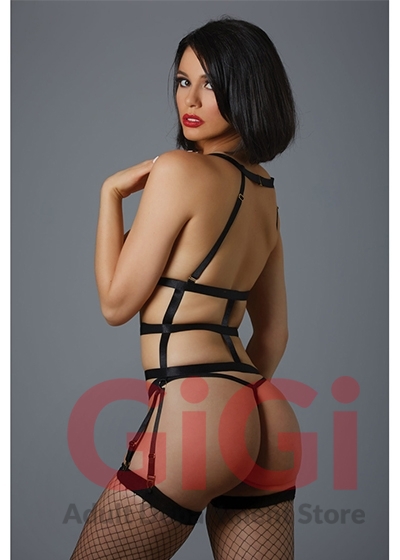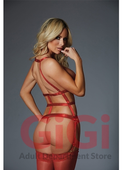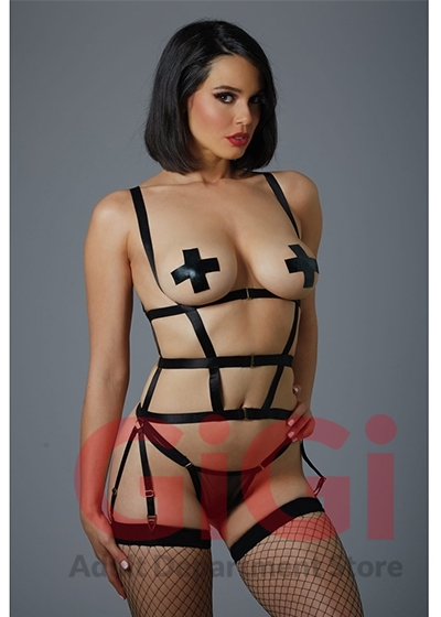 Blur the line between Lust and Love. Luxe straps accentuate every sensual curve with gold accents adding a touch of elegance. The open back halter neck heightens the excitement while the unique V-shaped garter side straps add drama. Gold trimmed fishnet g-string is included.