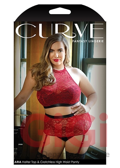 High Neck Lace Halter Tie Top and Matching High Waist Crotchless Panel Panty with Detachable Garters