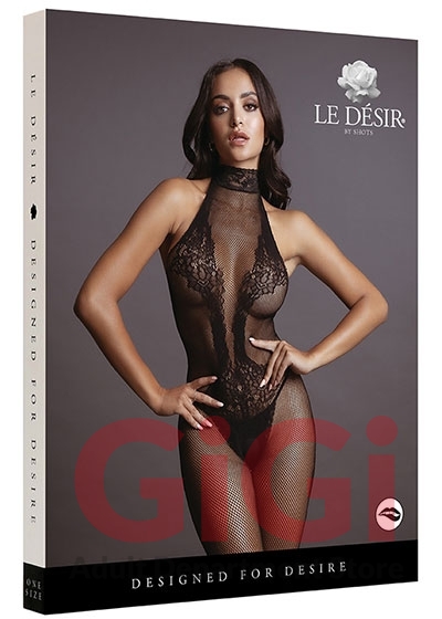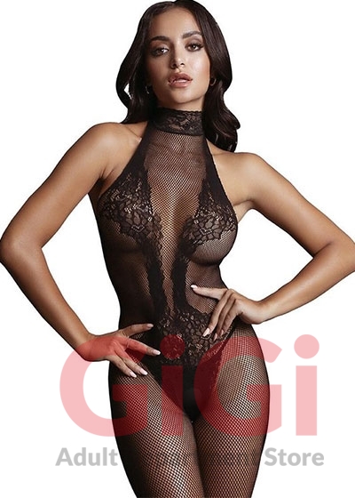 Bodystocking with a combination of lace pattern and fishnet, halter neck and open crotch. The soft, super elastic fabric is suitable for sizes S to XL.