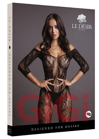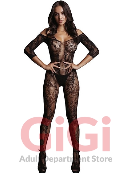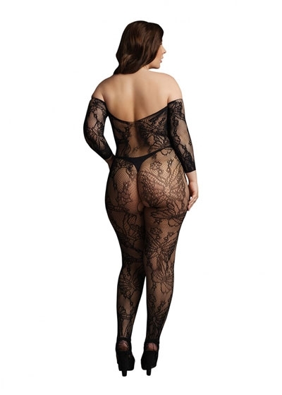 Bodystocking in a lace pattern with long sleeves and open crotch. Can be worn on or off the shoulders. The soft, super-elastic fabric.