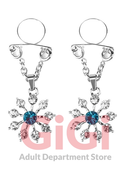 Accessorize your bodacious tatas with these sexy nipple tassels featuring round silver nipple clamps, silver link chain accents, and a drop bedazzled star accent with blue and silver rhinestones.