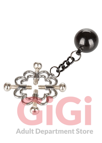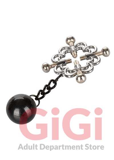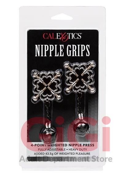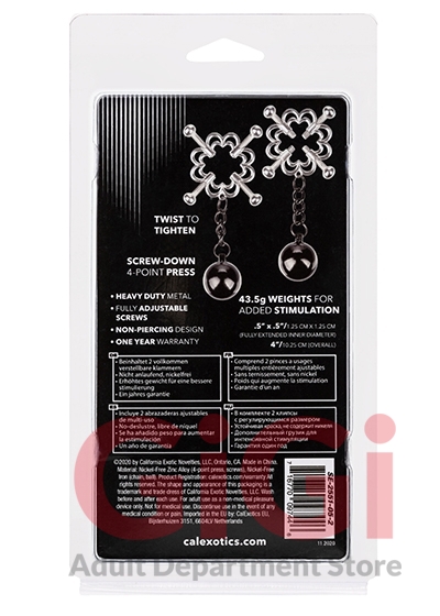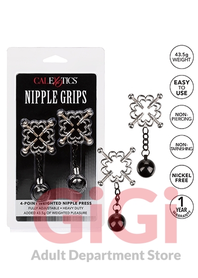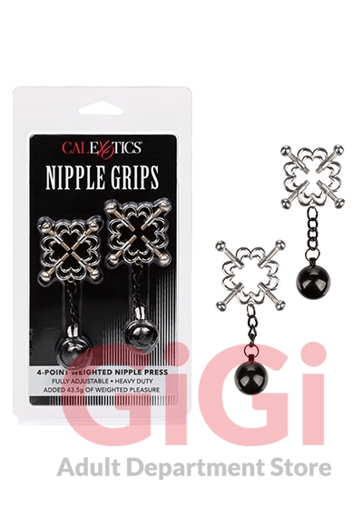 The Nipple Grips 4-Point Weighed Nipple Press is designed for sensational nipple play. Tighten the screws to exactly the pressure you desire, and let the weights pull and tug for even more intense pleasure.