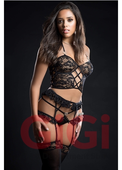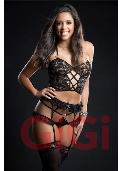 The irresistable balance of sexy and sweet strikes in a lacy cami top with front criss cross, ruffle garter belt and cut out pantyhugger. Heart charm details. Sttockings are included