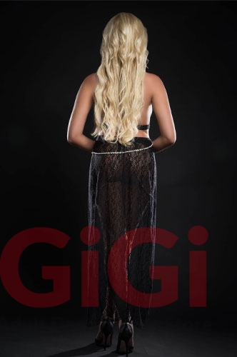 Edgy elegant lace makes a sexy statement on a cut out flyaway long gown with open front ribbon and embellished pearl chain and criss cross details. Matching panty included.