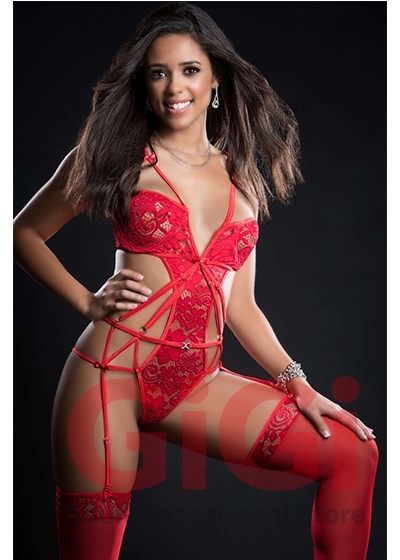 2pc Embroidered Lace Garter Teddy and Stockings - One Size - Candy Red