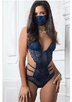 A provocative strappy teddy comes with kisses of lace and straps over sheer mesh and matching playful mask.