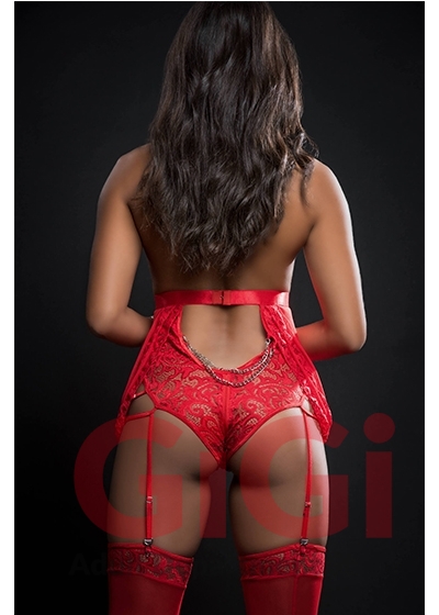 Ultimate after-hours O-ring garter babydoll, accentuate your silhouette in a glamorous mix oflace and mesh, deep plunging neckline with chains, and ultra sexy open crotch zipper. Includes stockings.