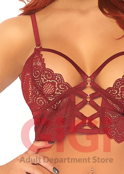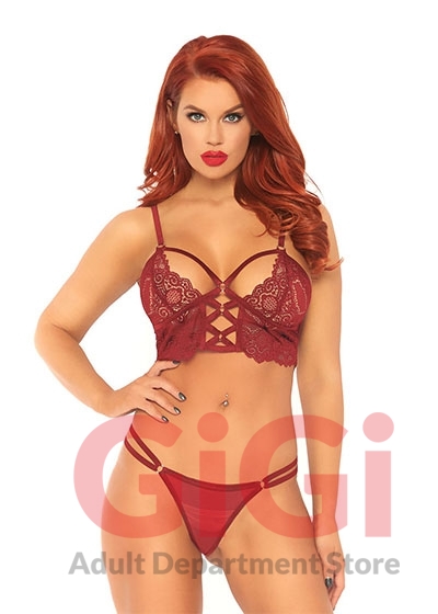 2 Pc Lace Bralette With Cage Strap O-Ring Bodice Detail and Matching G-String - Burgandy