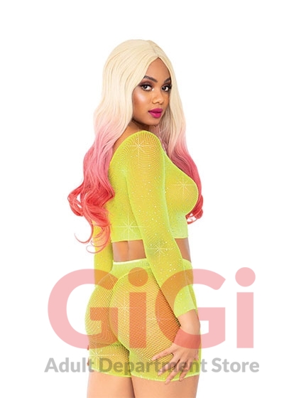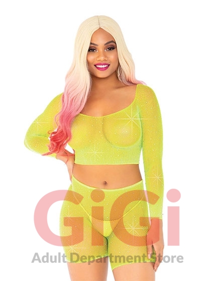 2 Pc Rhinestone Fishnet Crop Top and Biker Shorts - One Size - Neon Yellow