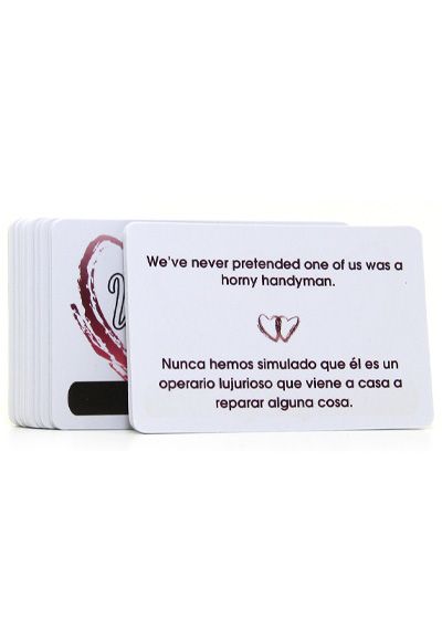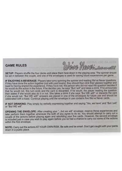 Included in the set are 120 cards split into four categories, 40 Location, Location, Location, 40 Erotic Edibles and Other Indulgences, 40 Fun and Games and Toys, Toys Toys, and 40 Fantasy and Role Play cards plus a spinner. Twirl the spinner to see which category you'll be choosing from, and draw a card. On it, a sexy activity is spelled out, you'll toast with a favorite beverage if you've done the deed, or save the card in one of two But We Will envelopes if not (but would like to). Game rules included.