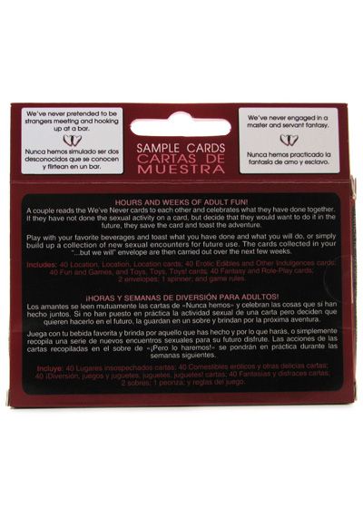 Combining drinks, toys, secrets and intimate surprises into a sexy little game of couples, the We've Never...But We Will game follows along the lines as the classic tell-all drinking game. Instead of embarrassing secrets however, this version was specifically created to inspire and engage lovers.