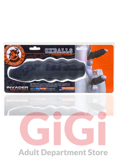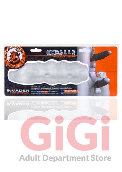 Oxballs invented the modern cocksheath by morphing the original COCKSLING to a sheath, creating the first sheath that really stays on no matter how hard you play. INVADER is that good and more - an open-ended sheath with wavy ripples on the shaft, and texture inside, so everyone gets max stimulation. Made of PLUS+SILICONE™, Oxballs' slick soft silicone & stretchy TPR blend.