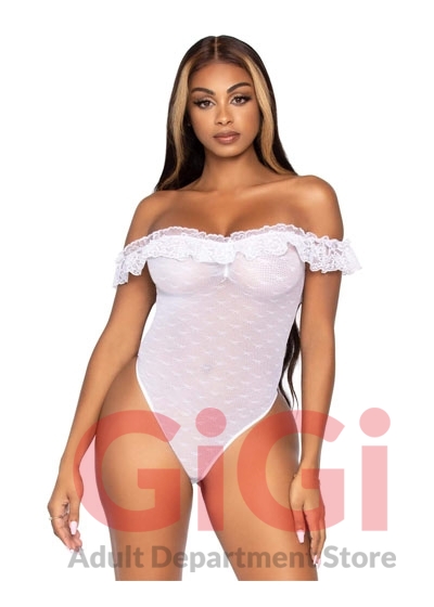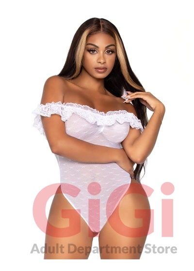 The lace ruffle lingerie teddy by Leg Avenue is a romantic dream. The flirty lace ruffle off the shoulder women's bodysuit features a woven point d 'esprit detail and snap crotch for easy wear. This sexy lingerie piece is perfect for the bedroom or paired with jeans.
