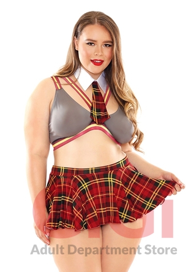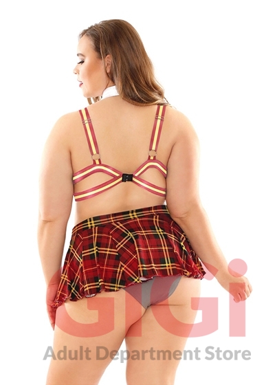 Get sorted into this all new 4 piece set. A Spellbinding Caged Bra Top with thick, adjustable straps, Tie Collar, Microfiber plaid skirt and matching panty. So good, it'll make you believe in magic.