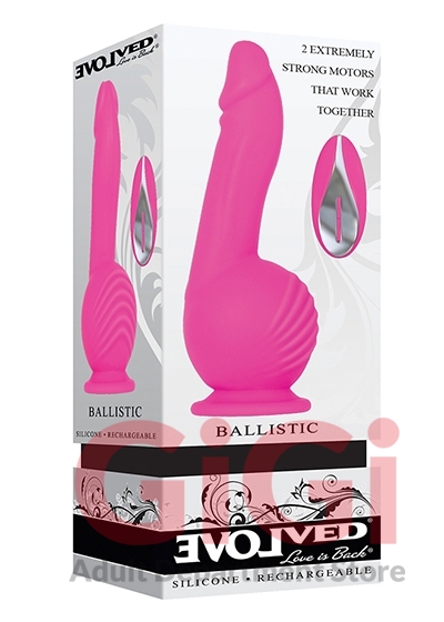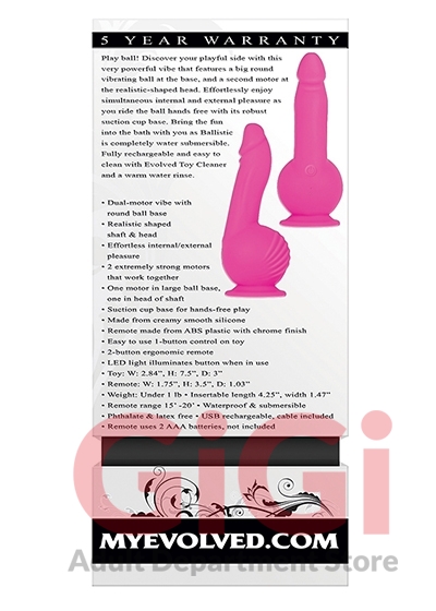 Ballistic Play ball! Discover your playful side with this very powerful vibe that features a big round vibrating ball at the base, and a second motor at the realistic-shaped head. Effortlessly enjoy simultaneous internal and external pleasure as you ride the ball hands free with its robust suction cup base. Bring the fun into the bath with you as Ballistic is completely water submersible. Fully rechargeable and easy to clean with Evolved Toy Cleaner and a warm water rinse.