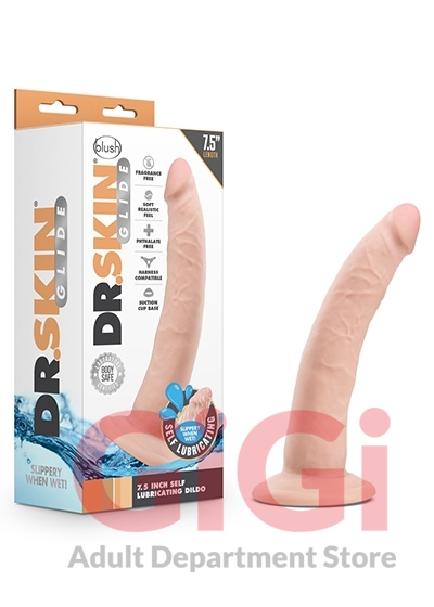 The doctor is in! The Dr. Skin Glide 7.5 Inch Self Lubricating Dildo is a realistic, self lubricating toy that only needs a bit of water to get slippery! The Dr. Skin Glide has a sturdy suction cup base that will hold to any flat surface and is harness compatible. Made from body safe TPE, this toy contains no Fragrances, Phthalates, Paraffins, or Latex. Self lubricating properties are temporary. It will last up to 12 uses. To clean, wash with soap and water. Pat dry and allow to air dry before storing. Use product only with water based lubricants. It is recommended to start using water based lubricants after self lubricating properties begin to diminish