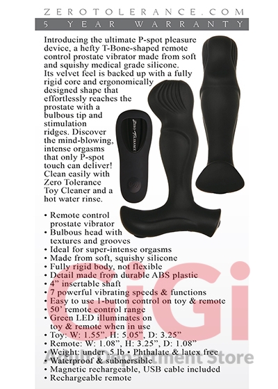 T-Bone Introducing the ultimate P-spot pleasure device, a hefty T-Bone-shaped remote control prostate vibrator made from soft and squishy medical grade silicone. Its velvet feel is backed up with a fully rigid core and ergonomically designed shape that effortlessly reaches the prostate with a bulbous tip and stimulation ridges. Discover the mind-blowing, intense orgasms that only P-spot touch can deliver! Clean easily with ZT Toy Cleaner and a hot water rinse.