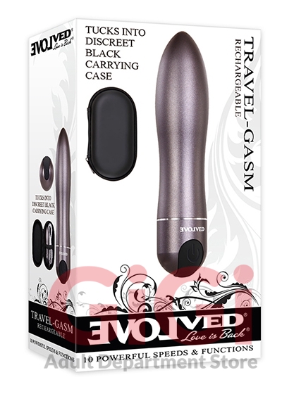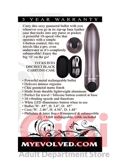 Travel-Gasm Carry this sexy gunmetal bullet with you wherever you go in its zip-up faux leather case that tucks into any purse or pocket. A powerful 10-speed vibe that operates with a simple 1-button control, this toy travels like a pro, even underwater as it’s completely submersible! Enjoy the big ‘O’ on the go!