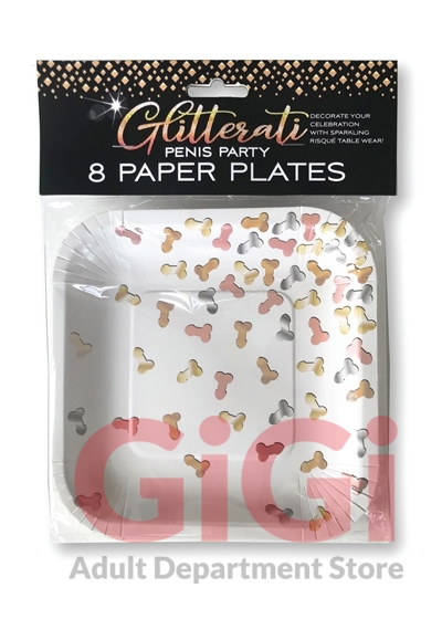 Glitterati Plates from Little Genie. Decorate your celebration with sparkling risque table ware. 8 paper plates.