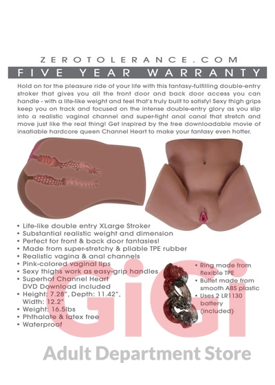 Hold on for the pleasure ride of your life with this fantasy-fulfilling double-entry stroker that gives you all the front door and back door access you can handle - with a life-like weight and feel that’s truly built to satisfy! Sexy thigh grips keep you on track and focused on the intense double-entry glory as you slip into a realistic vaginal channel and super-tight anal canal that stretch and move just like the real thing! Get inspired by the free downloadable movie of insatiable hardcore queen Channel Heart to make your fantasy even hotter.