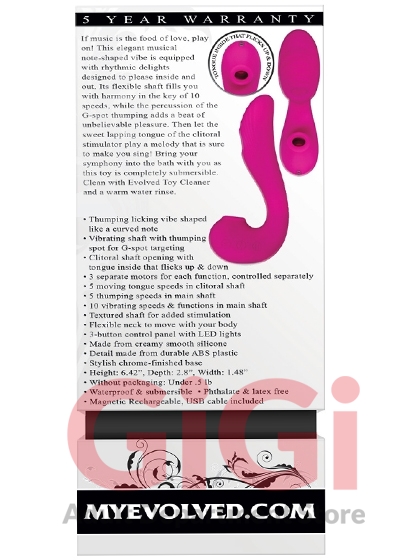 If music is the food of love, play on! This elegant musical note-shaped vibe is equipped with rhythmic delights designed to please inside and out. Its flexible shaft fills you with harmony in the key of 10 speeds, while the percussion of the G-spot thumping adds a beat of unbelievable pleasure. Then let the sweet lapping tongue of the clitoral stimulator play a melody that is sure to make you sing! Bring your symphony into the bath with you as this toy is completely submersible. Clean with Evolved Toy Cleaner and a warm water rinse.
