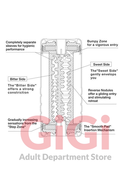 Each passage has a number of different nubs that give different sensations, depending on which orifice is entered. The red or "Bitter” side is tight and grips firmly with 63 nubs in a narrow passage, whilst the silver or "Sweet” side gently wraps around your member with its 73 nubs. Alternating between the sides simultaneously can transport you to another level of pleasure; A two-in-one blend of stimulation!