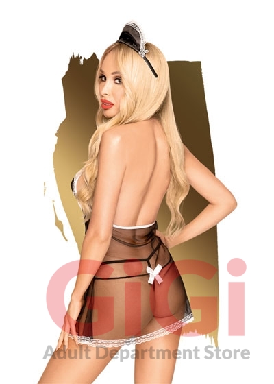 How about room service, but with that little something extra? If you've always wanted to live out your wildest hotel sex fantasies, this sexy outfit is the right costume for your scenario. The tight dress is made of fine mesh and is adorned with white lace details at the hem. A front lacing and a cute apron application give the dress an authentic look. The design is rounded off by decorative bows. The set also includes a headband and a string to match the dress, that complete the outfit.