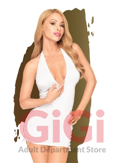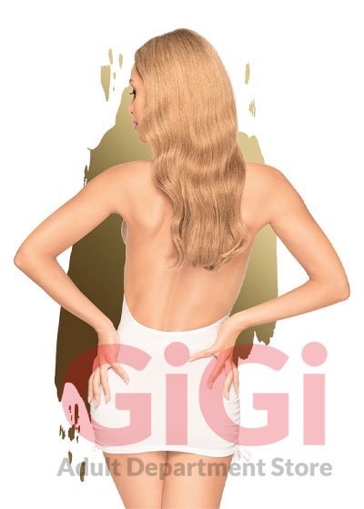 A semi-sheer mini dress with a V-neckline and a fully exposed back. Wear it to divert gazes.