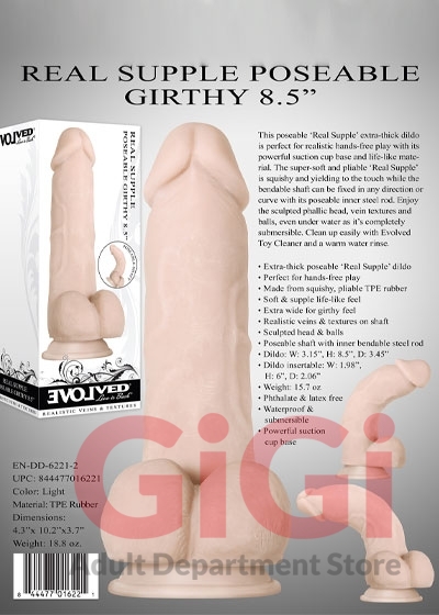 This poseable 'Real Supple' extra-thick dildo is perfect for realistic hands- free play with it's powerful suction cup base and life-like material. The super-soft and pliable 'Real Supple' is squishy and yielding to the touch while the bendable shaft can be fixed in any direction or curve with it's poseable inner steel rod. Enjoy the sculpted phallic head, vein textures and balls, even under water as it's completely submersible. Clean up easily with Evolved Toy Cleaner and a warm water rinse.